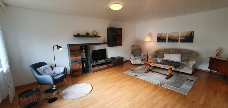 1 großes Wohn- und Esszimmer mit gemütlicher Leseecke, Couch mit zwei Sesseln und Tisch, rechteckiger Esstisch mit Stühlen, WLAN, Flachbildschirm, Radio mit CD-Player.